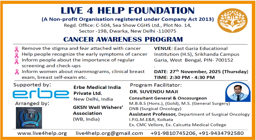 Live 4 Help Foundation, in partnership with GKSN Well Wishers’ Association and with the generous sponsorship of Erbe Medical India Pvt Limited, successfully conducted a Cancer Awareness Program on November 27, 2025. This initiative was made possible through the collaborative efforts of our sponsors, school authorities, and dedicated volunteers.
